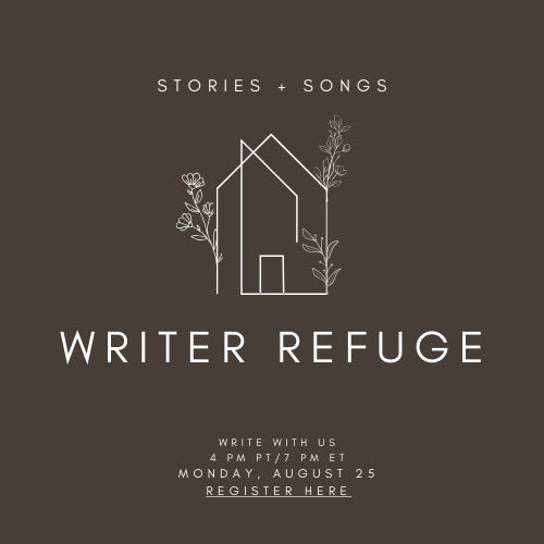 Stories + Songs Writer Refuge free writing zoom - 4 p.m. Pacific/7 p.m. Eastern on Aug. 25