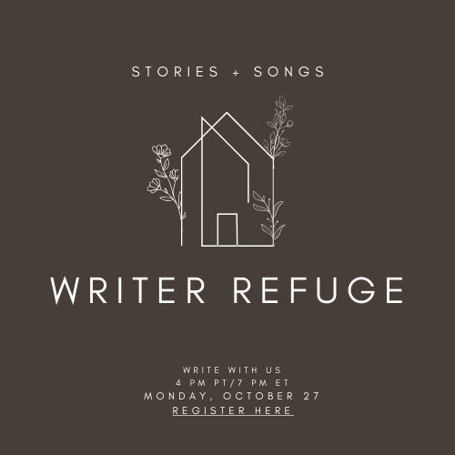 Stories + Songs Writer Refuge free writing zoom - 4 p.m. Pacific/7 p.m. Eastern on Oct. 27